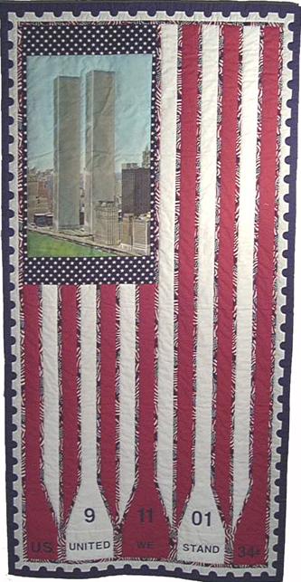 All photos © Drunell Levinson. All rights reserved. I chose to use the design of the American flag for this quilt because I feel that its current popularity represents proof of the healing process taking place. Healing means new growth. It is only possible after being saturated by the pain and ugliness of an injury. It is an act of affirmation. We have witnessed a tremendous show of unity in the form of pride in our flag, a pride unprecedented in my lifetime. Like a concrete that binds us, or steel girders that support us, the U.S. flag has been omnipresent in the wake of September 11. The thirteen stripes in my pieced flag are complemented with narrow bands of flag-printed fabric. These bands suggest the steel supporting the World Trade Center. They flow together at the bottom of the quilt in a design reminiscent of the bottom tier of the Twin Towers. The field of fifty stars on our flag represents the union of fifty states. The woven picture pieced into this field represents the nationwide impact of the destruction that touched three states. Historically, both quilts and stamps have been used to honor, commemorate, and educate. United We Stand is the thirty-fourth quilt in a series that I began in 1980, of quilts with a postage stamp theme. The process of producing this quilt, particularly the hand appliquéd border, afforded many hours of meditation and prayer. Much of the hand sewing of the "perforated stamp edge" was done on my daily commute from New Jersey into New York – the highlight of which had always been the Twin Towers coming into view. I still find myself looking up, expecting to see them as the train approaches the city. | |||