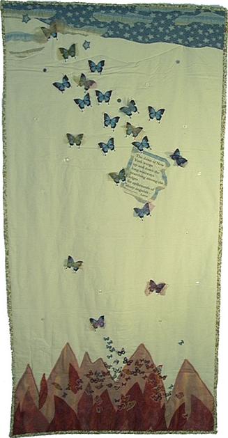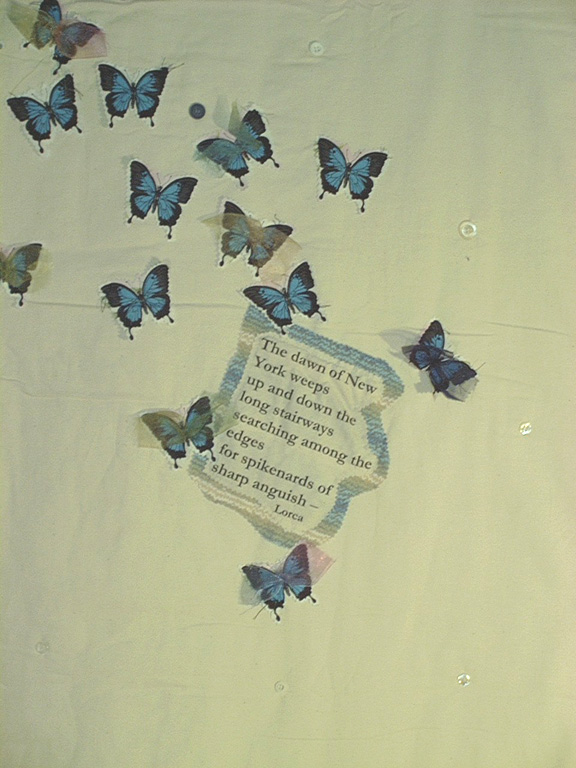 All photos © Drunell Levinson. All rights reserved. Among the people who died at the Twin Towers on September Eleven were twenty Australians. My quilt panel commemorates those twenty lives, illustrating them as twenty Ulysses butterflies. The Ulysses butterfly lives in the Australian tropical rainforest. I have included in the design a translatin of a few lines of poetry from Federico Garcia Lorca, expressing in words written long before the Twin Towers were even imagined, something of the anguish of New York under attack. I constructed the panel from calico onto which I appliqued images of butterflies cut from fabric designed and made in Australia. The visual side of the work is not quilted, but rather fixed randomly with buttons, leaving the space between the flames of the buildings and the stars of the sky open, attracting silent thoughts. The edging is cut from floral Liberty fabric, suggesting life, and also a yearning for nature, peace, and freedom. It is not always clear how people not closely and personally affected by tragedy can contribute to the cause of healing, can express how they feel in response to what has happened. Making the panel has given me a sense of participation in the grief and also in the hope that comes with the realization of membership in the wider human family. I am grateful to Drunell for her role in the whole project, and to Elia Alba for her friendship and her invitation to make a panel for the quilt. | |||