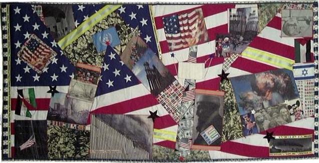 My quilt was inspired by many thoughts: the tragic loss of life of people of 80 nations, not just our own; the senseless destruction of property and the disruption of the infastructure of New York, especially; the complacency and arrogance of our nation in not recognizing our own vulnerability; and the incredible contrast of the cultural values between Afganistan and the United States. I used photo transfers taken from newspapers and magazines and friends, small flags from the United Nations, tie-dyed leather to indicate Ground Zero, star buttons and black sequined stars, a hospital mask, and fluorescent fireman tape. I found a necktie for sale on Canal Street depicting our Flag superimposed on U.S. money of all denominations. A large American flag was cut up and appliquéd together with all the various elements. The image of the burning flag has a dual meaning: the first amendment right to free speech (dissent) and the damage to our nation. The juxtaposition of Disney images with Afghan and Trade Center images intends to illustrate cultural differences. Since the completion of the quilt, I still am haunted by certain of these images, especially that of the person jumping to his death. I often touch the quilt just there.