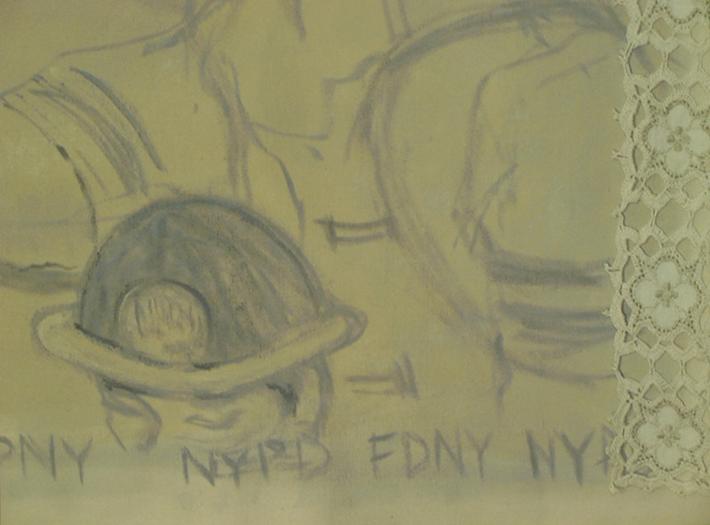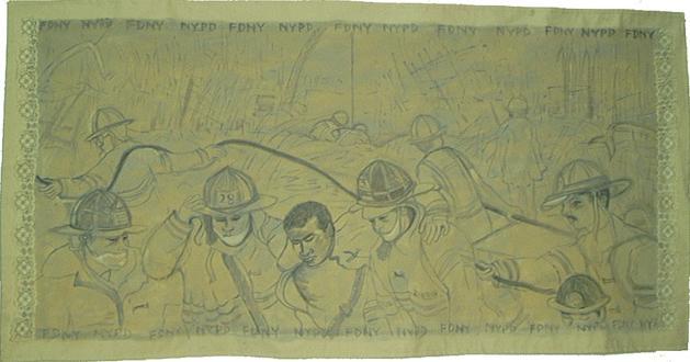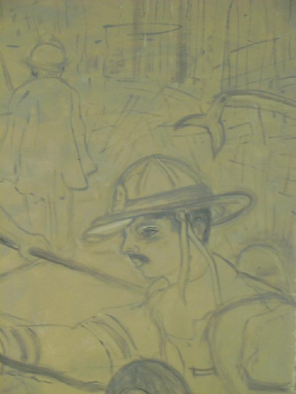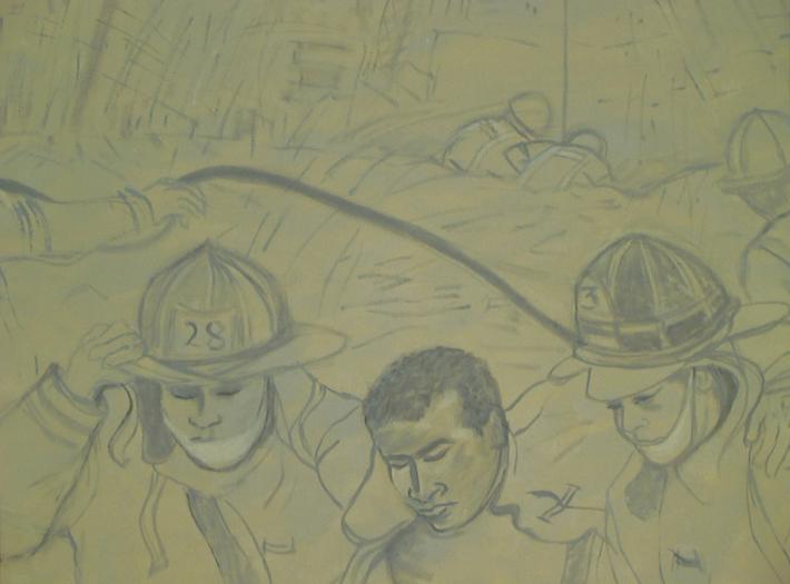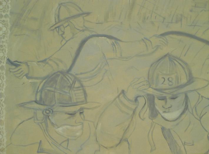 The painting is intentionally soft-pedaled with grey hues on cream. The poetry of ambiguity is: focused rescue in somber smoke, the activity of recovery through difficult and heavy pollution for breathing.