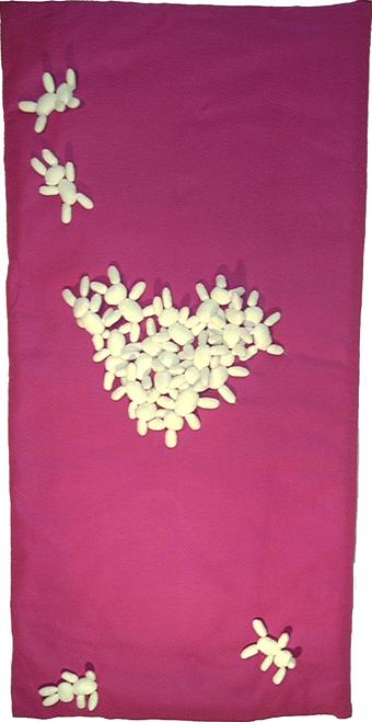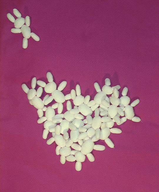 The rabbits are gathered in the middle in the shape of a heart. The heart